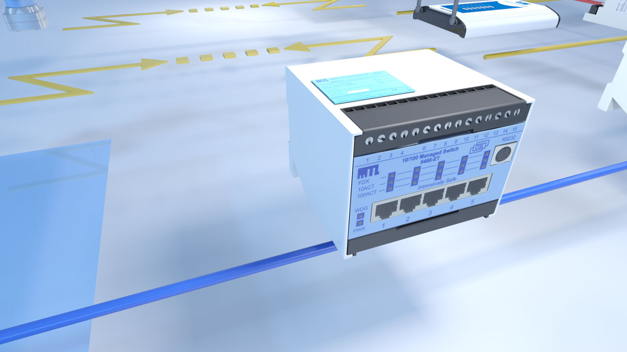 The 9466-ET 10/100Mbps, Layer 2, Ethernet switch allows the interconnection of MTL 9400-ET series networking modules via its 5 ports. It also enables an Ethernet network to cover a greater distance using either Cat5e cable or fibre-optic for longer spans. This capability is due to the low latency ‘store and forward’ mechanism integral to the switch, which ensures that the stringent timing associated with Ethernet is maintained.